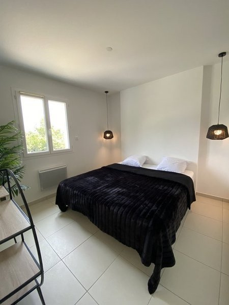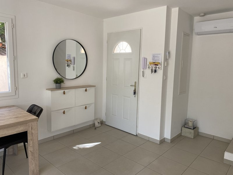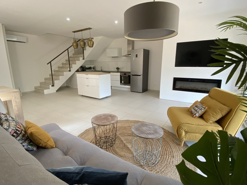 Sejour, Cuisine ouverte aménagée et équip avec hotte et four. 3 Chambres, salle de bains, 2 Wc indépendants, Terrasse de 20 m2, Jardin clôturé de 350 m2, Parking avec recharge pour véhicule électrique.