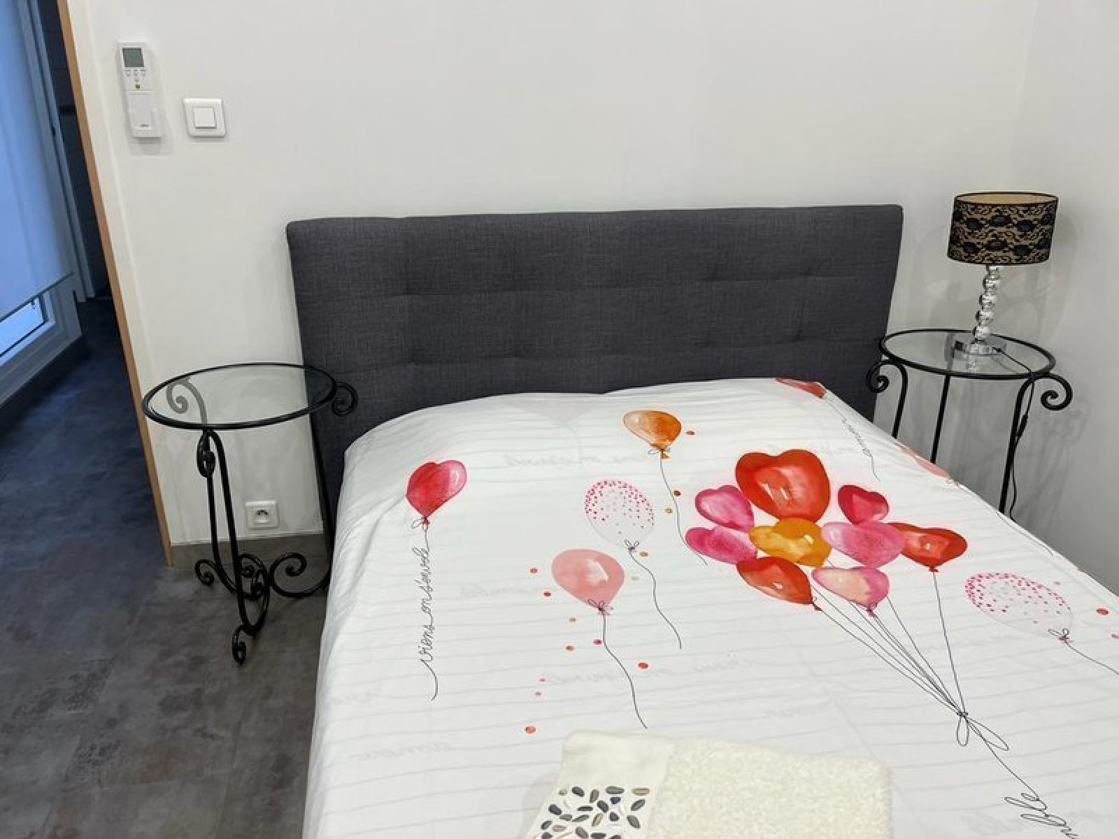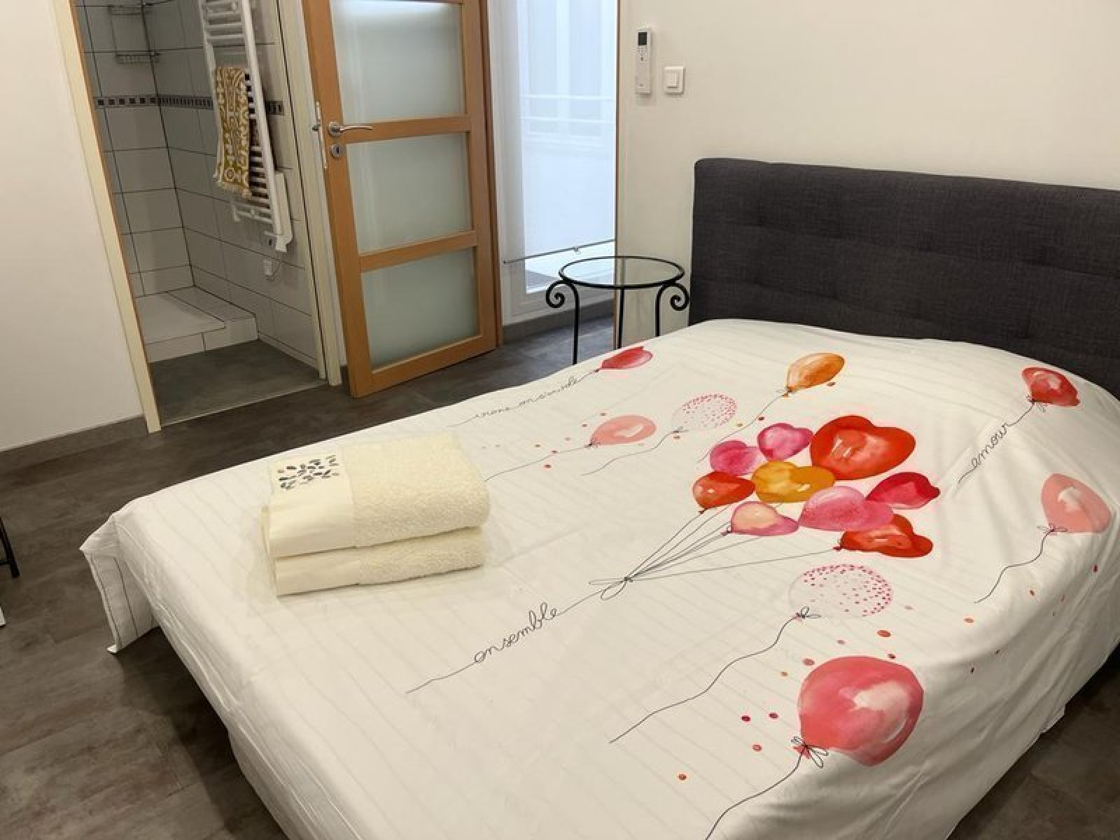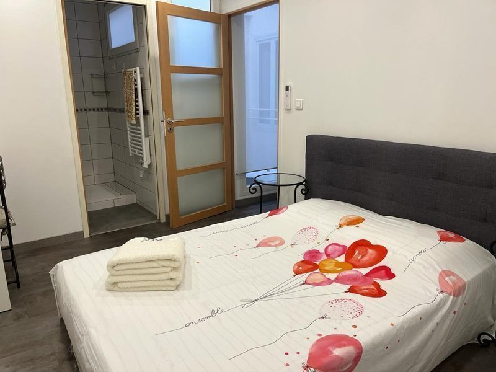 Il se compose d'un séjour, d'une cuisine équipée (micro-ondes, plaques, frigo, lave-vaisselle et lave-linge). Vous y trouverez deux chambres de 12 m² et 10 m², chacune avec sa salle d'eau, ainsi qu'une salle d'eau supplémentaire. Les WC sont indépendants.