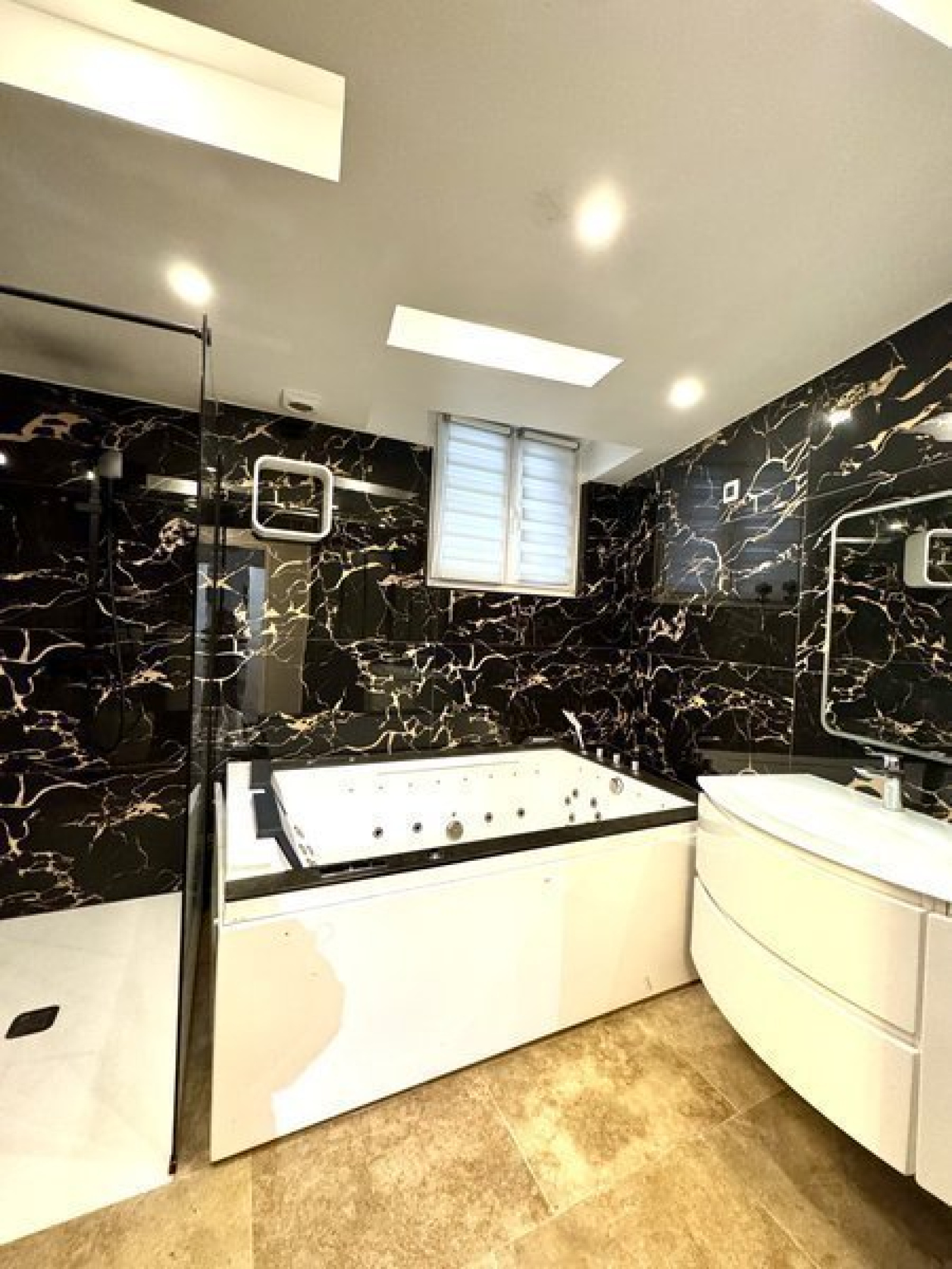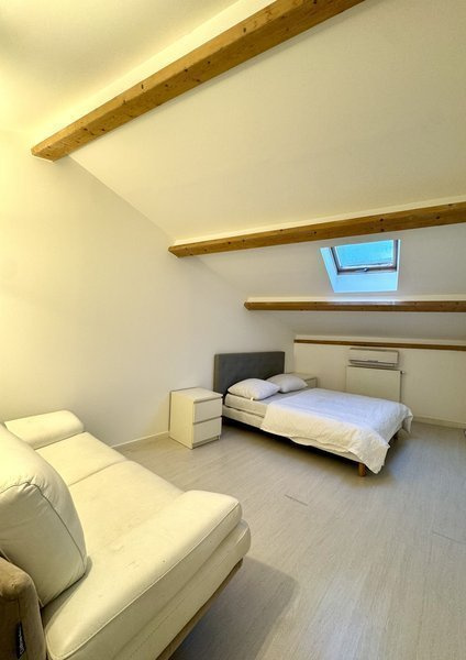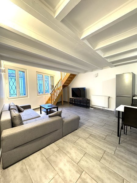 Hall, Sejour, Cuisine ouverte aménagée et équip avec hotte, frigo, congélateur, four, micro-ondes et plaques. 2 Chambres, Bureau, Cellier, salle de bains avec wc et jacuzzi, Cour (commune). - agent commercial - Loyer: 1480 €. FA: 1131€