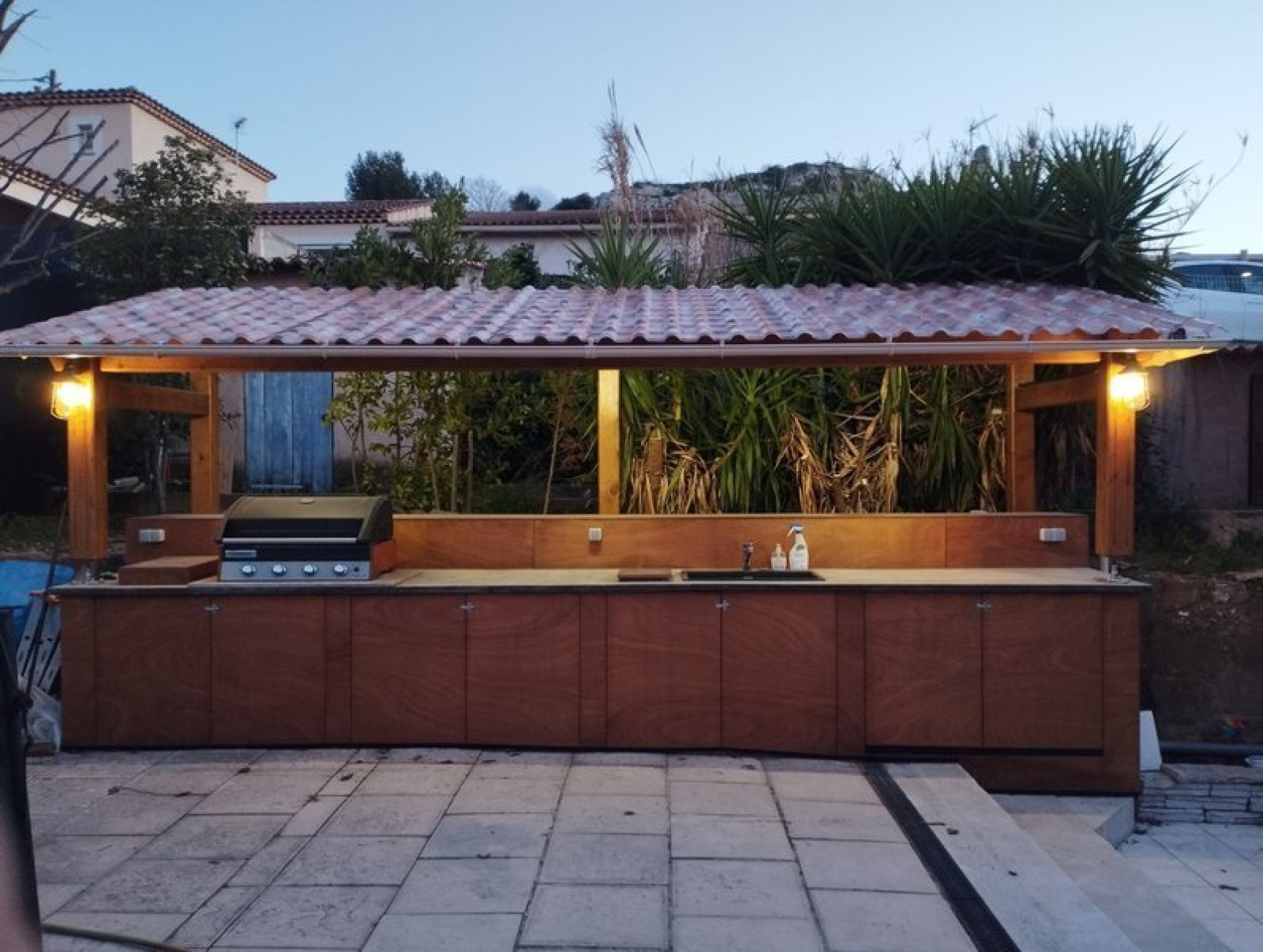 Sejour, Cuisine aménagée et équip avec hotte, frigo, four et plaques. 3 Chambres, salle de bains, Wc independant, Terrasse de 40 m2 avec cuisine d'exterieur, Piscine.