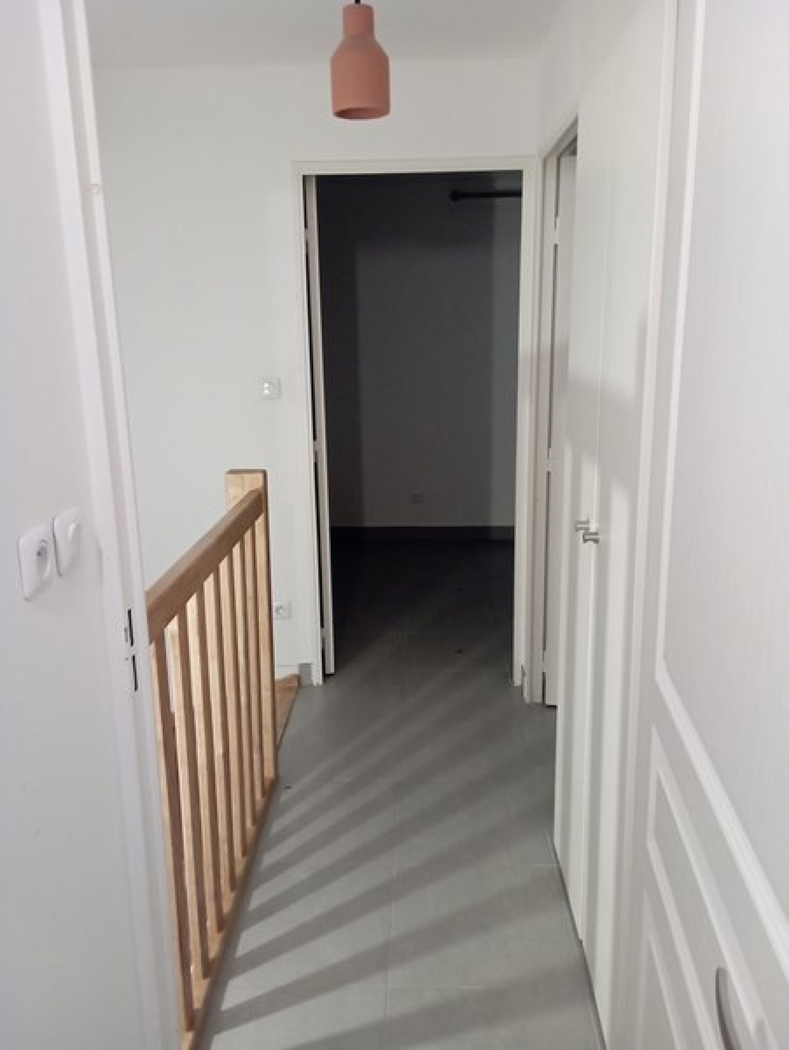 Au rez-de-chaussée, vous trouverez un hall d'entrée, un séjour agréable et une cuisine ouverte aménagée et équipée, comprenant une hotte, un four, des plaques de cuisson et un lave-vaisselle. Un WC indépendant complète ce niveau. À l'étage, deux chambres ainsi qu'une salle de bain avec vasque sont à votre disposition.