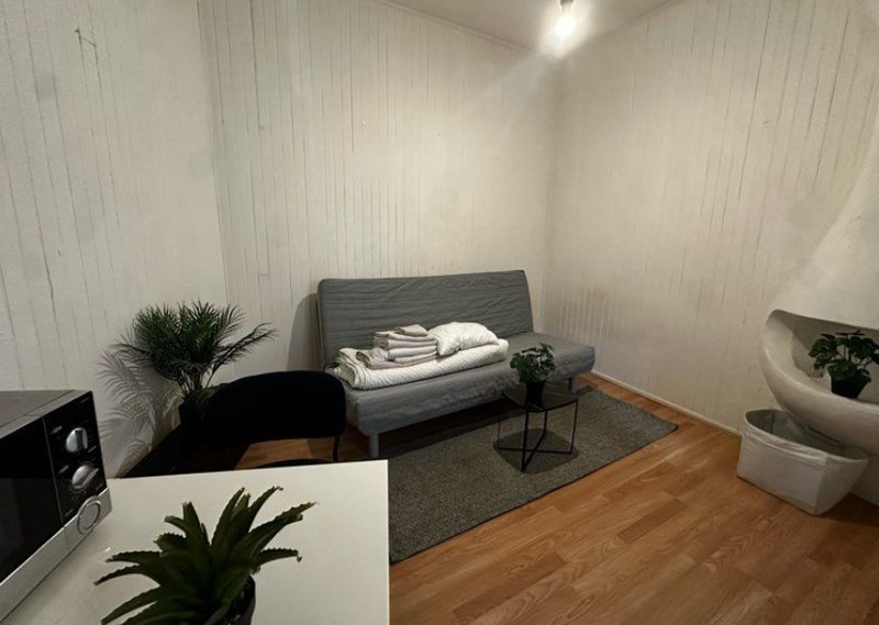 Le logement se compose d'un hall d'entrée, d'une pièce principale lumineuse, d'un coin cuisine entièrement équipé, et d'une salle d'eau avec WC. Bien que l'immeuble soit en bon état général, le logement est en état moyen. Le sol est revêtu d'une imitation parquet et l'exposition ensoleillée assure une belle luminosité.