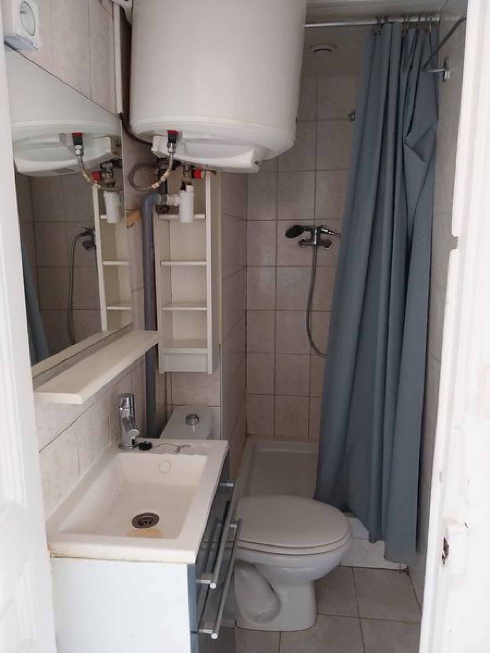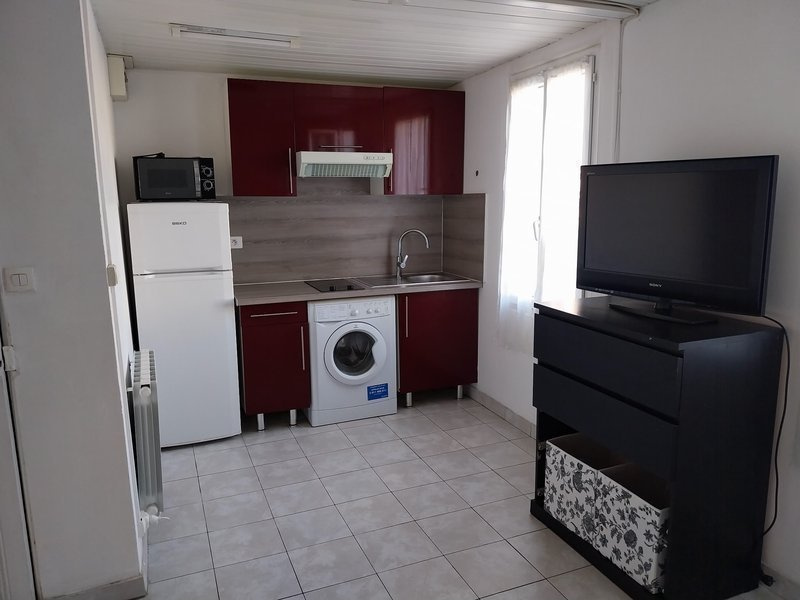 Ce logement est composé d'une pièce principale, d'une cuisine ouverte aménagée et équipée (plaques, frigo, lave-linge), et d'une salle d'eau avec WC.