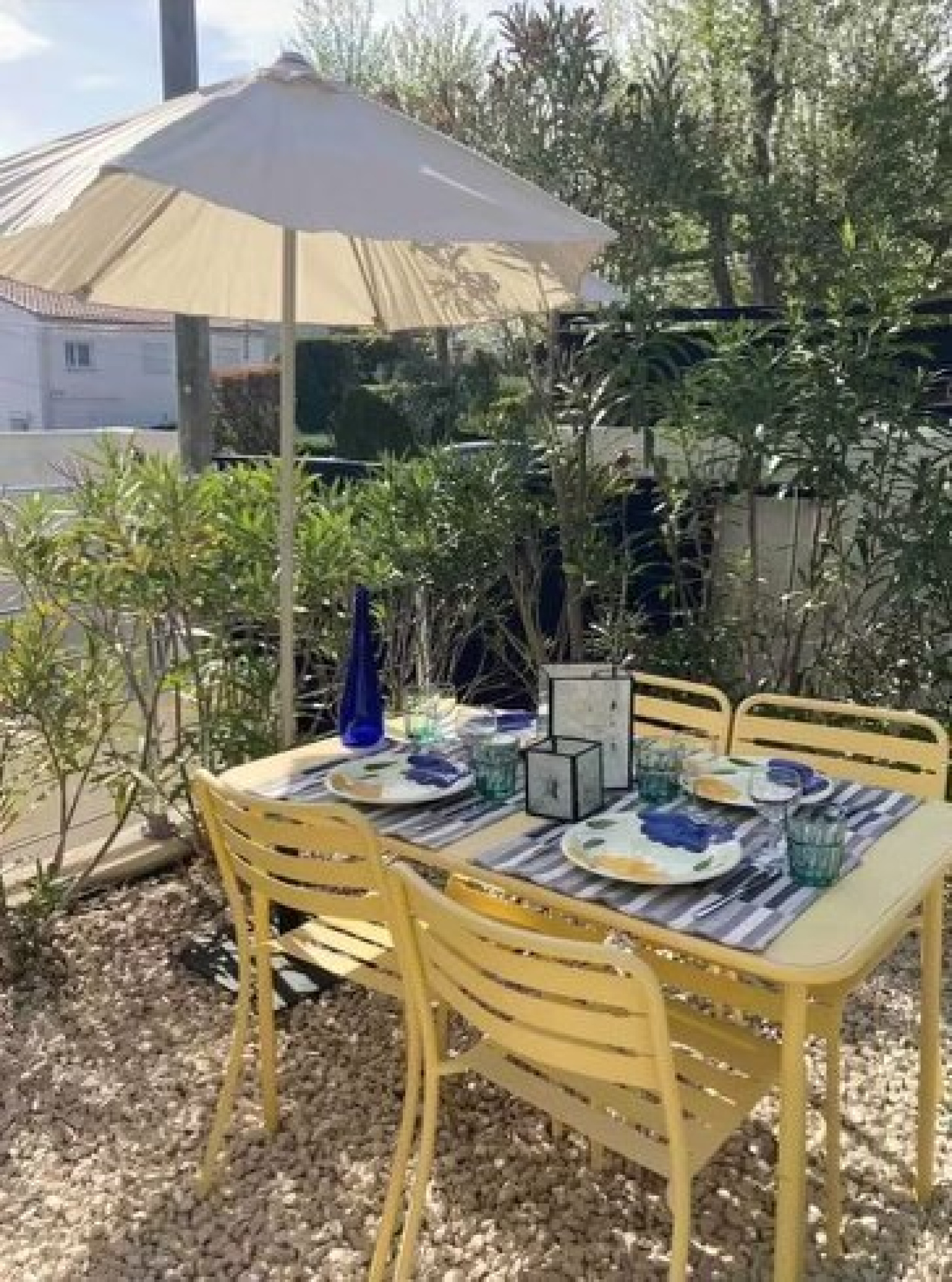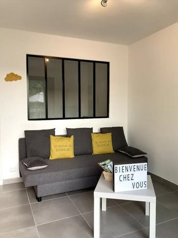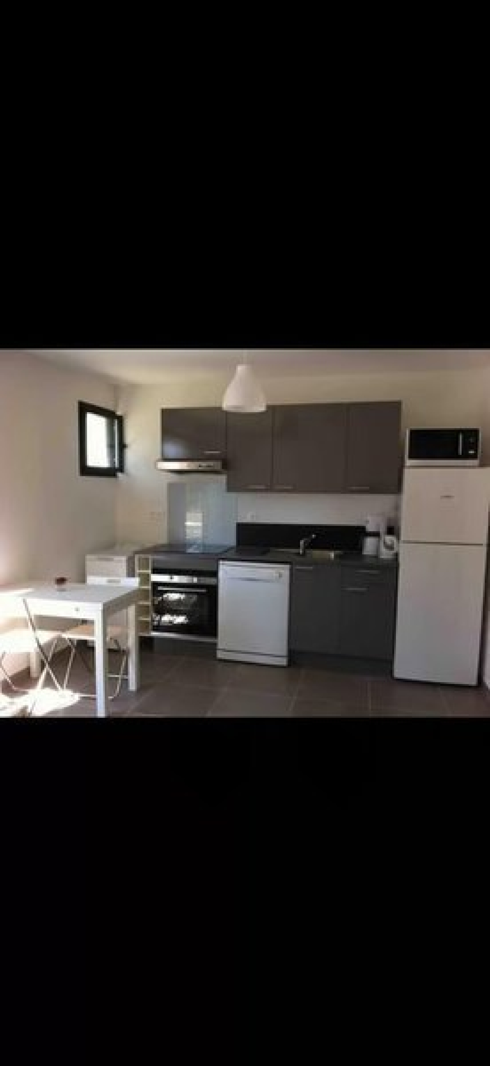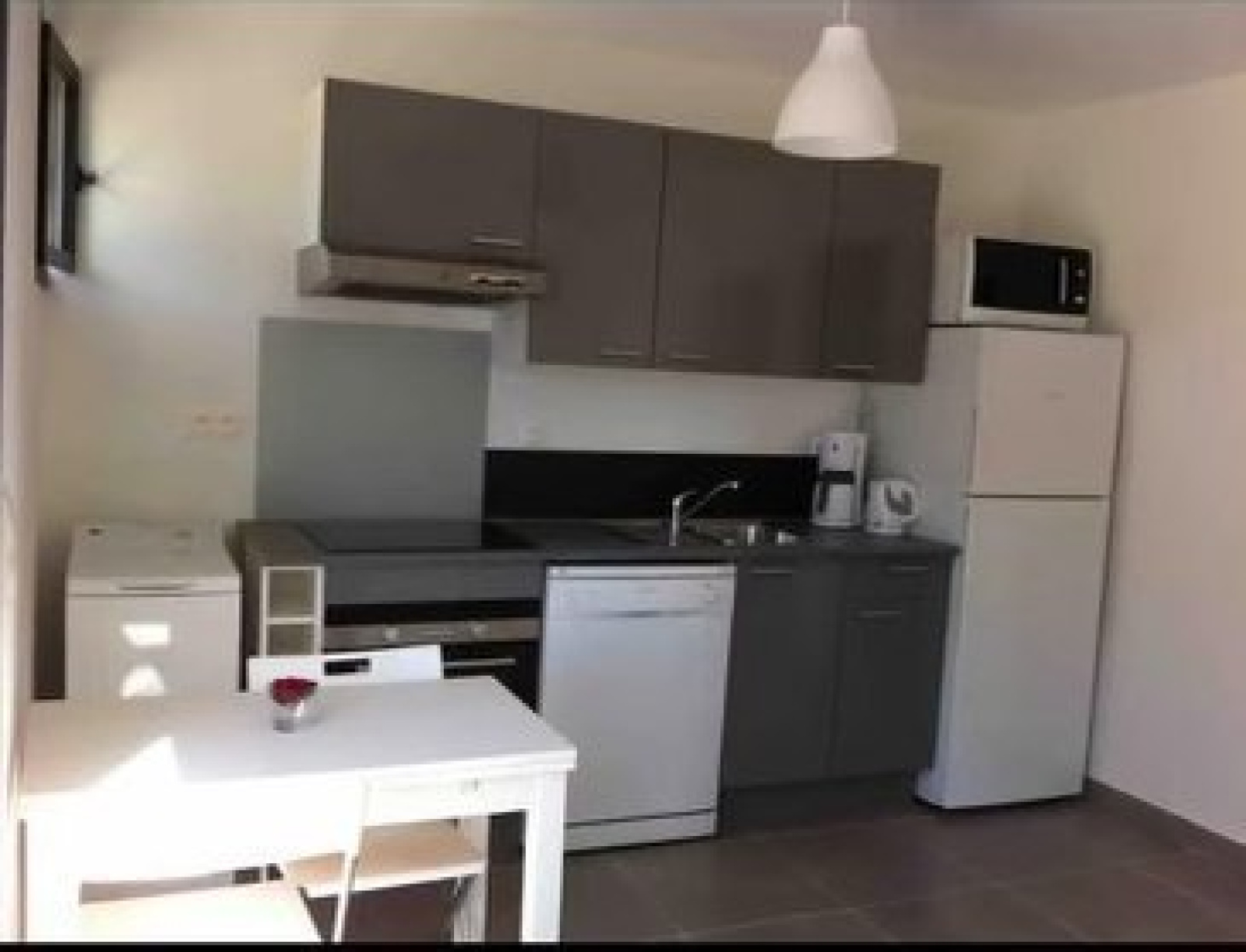 Sejour, Cuisine ouverte aménagée et équip avec hotte, frigo, four, micro-ondes et plaques. Chambre, salle d'eau avec wc, Jardin de 25 m2 clôturé, Parking libre dans la résidence.