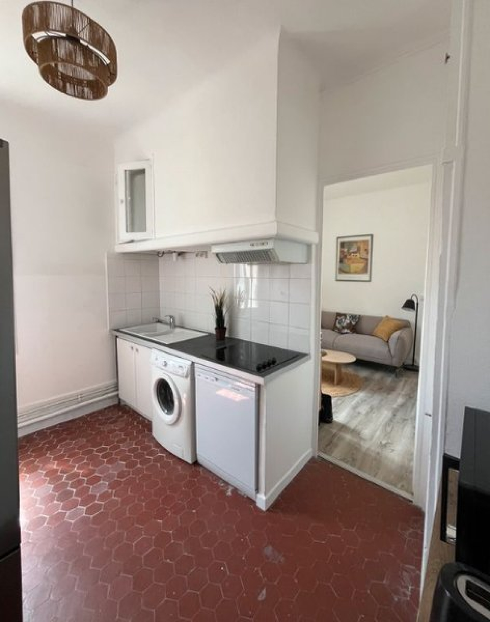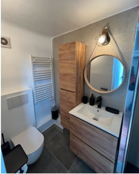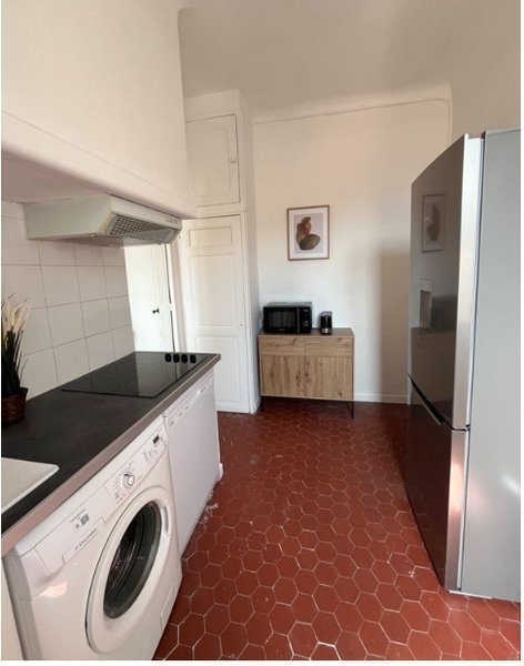 Sejour, Cuisine aménége et équip avec hotte, frigo, congélateur, four, micro-ondes et plaques. 2 Chambres, salle d'eau avec wc, Cour commune.