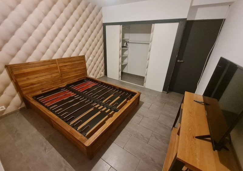 Sejour, Cuisine ouverte aménagée et équip avec frigo, four, micro-ondes et plaques. Chambre, salle d'eau avec wc.
