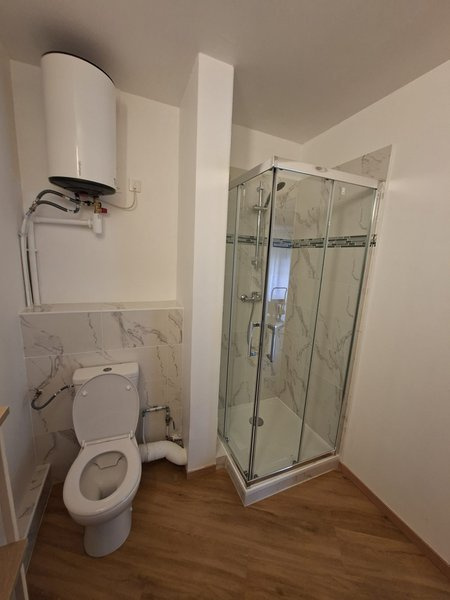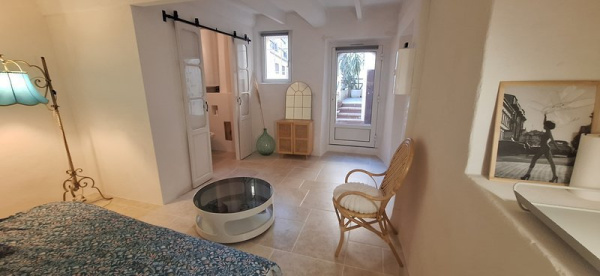 L'appartement comprend une pièce principale avec un coin cuisine aménagé et équipé de plaques, d'une hotte, d'un réfrigérateur, d'un lave-linge et d'un sèche-linge. Vous disposerez aussi d'une salle d'eau avec WC ainsi qu'un WC indépendant. À l'extérieur, profitez d'une agréable terrasse.