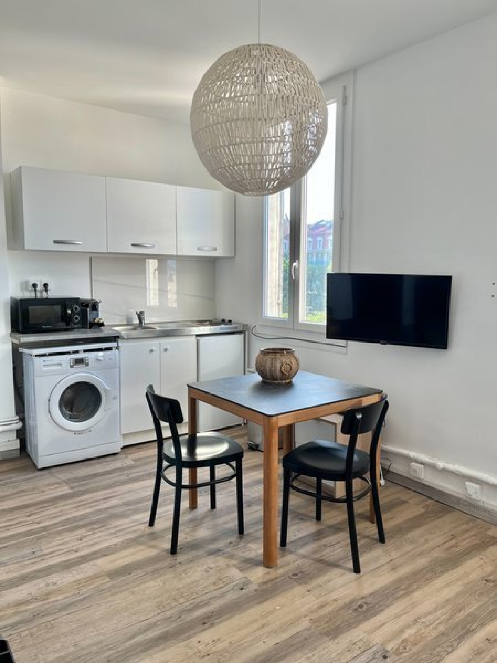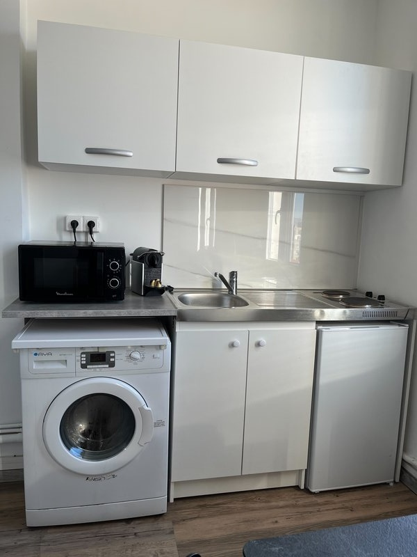 Ce logement comprend une pièce principale, une cuisine ouverte aménagée et équipée (micro-ondes, plaques électriques, réfrigérateur, lave-linge). Une salle d'eau avec WC est également présente. Le studio est meublé avec une télévision.