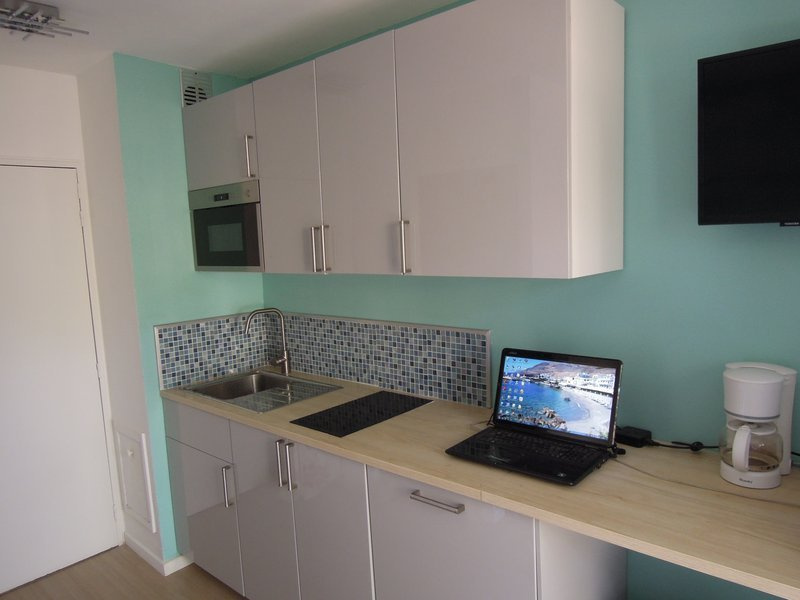 Le logement se compose d'une pièce de vie avec cuisine ouverte aménagée et équipée (plaques à induction, réfrigérateur, micro-ondes, cafetière) et d'une salle d'eau avec lave-linge et WC. Le revêtement de sol est en parquet.