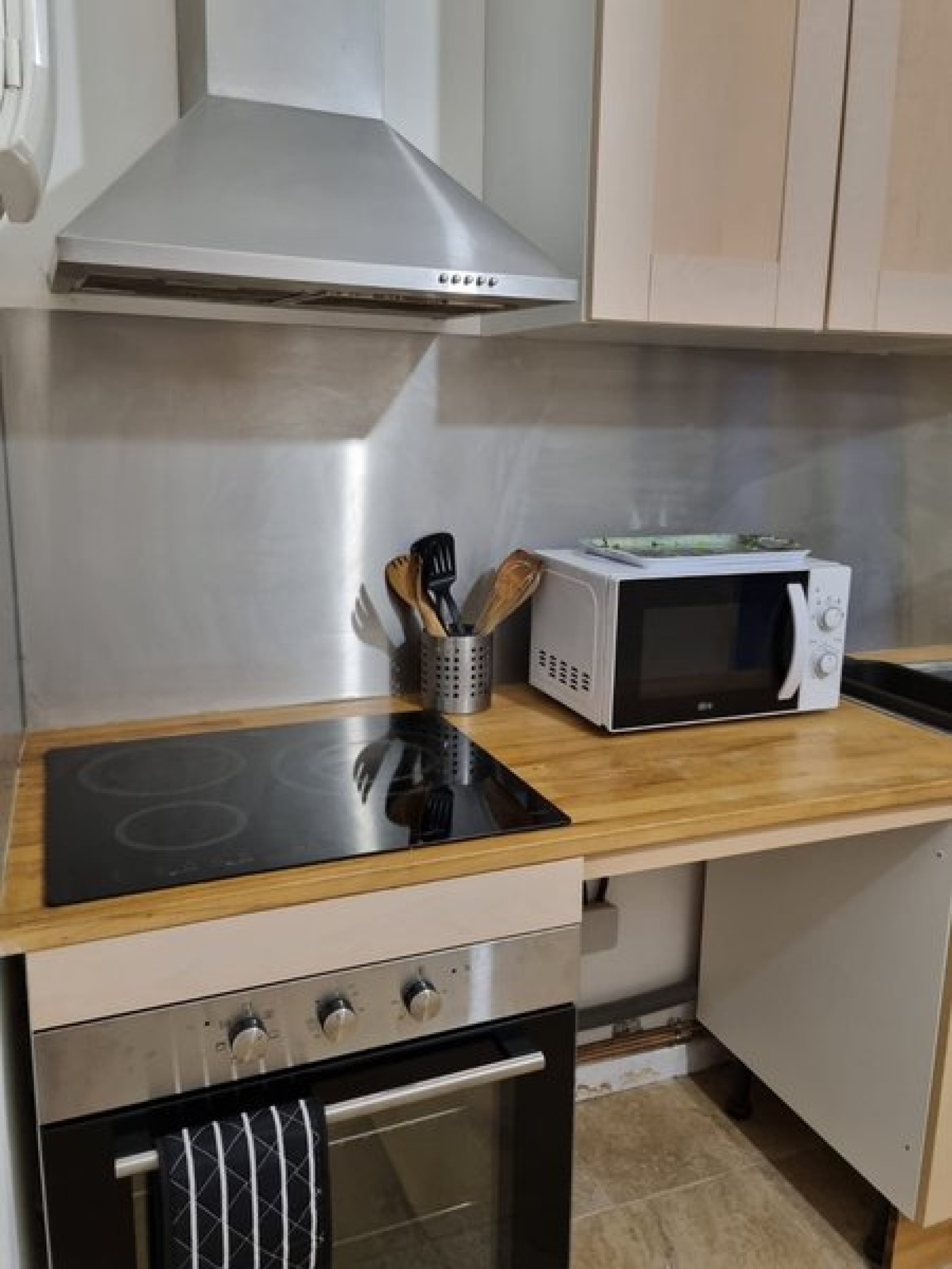 Cuisine ouverte, aménagée et équipée (hotte, four, plaques, réfrigérateur, congélateur)