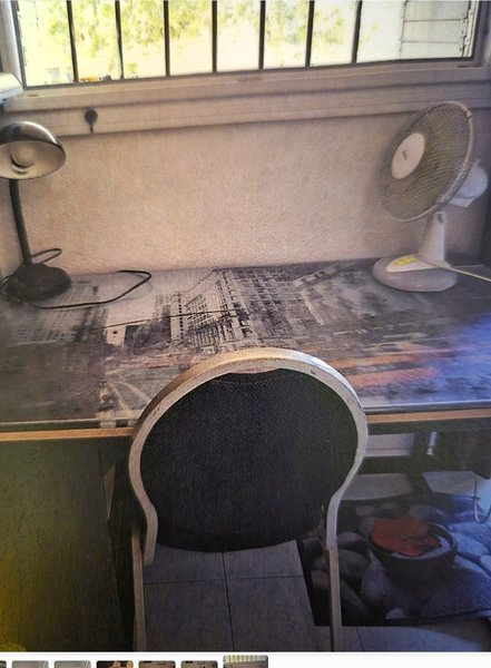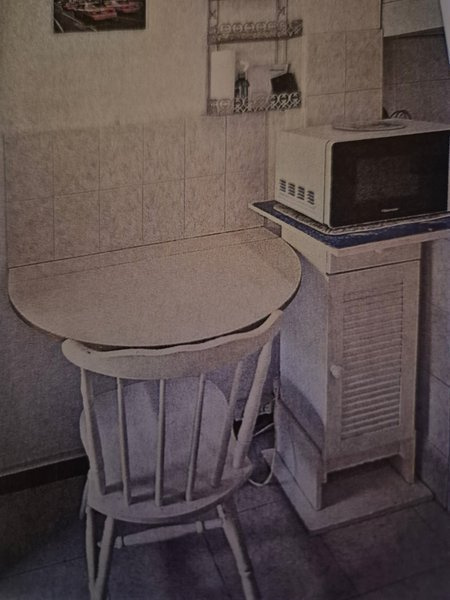 Le studio est meublé avec vaisselle, table, plaque, micro-onde, lit 1 place, réfrigérateur, chevet, 2 chaises, bureau et armoire.