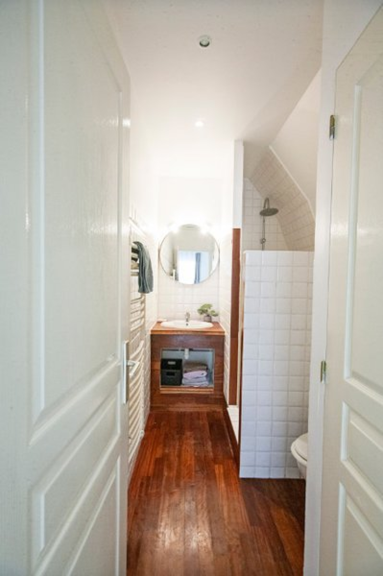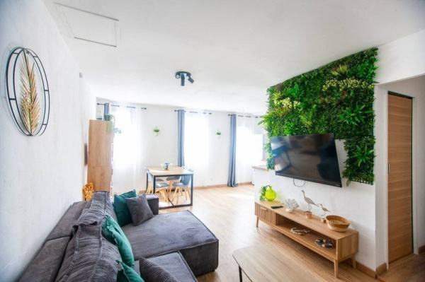 Ce logement comprend un séjour avec une cuisine ouverte, aménagée et équipée (hotte, four, plaques, frigo, lave-linge, lave-vaisselle). Il dispose également de deux chambres, d'une salle d'eau et de toilettes.