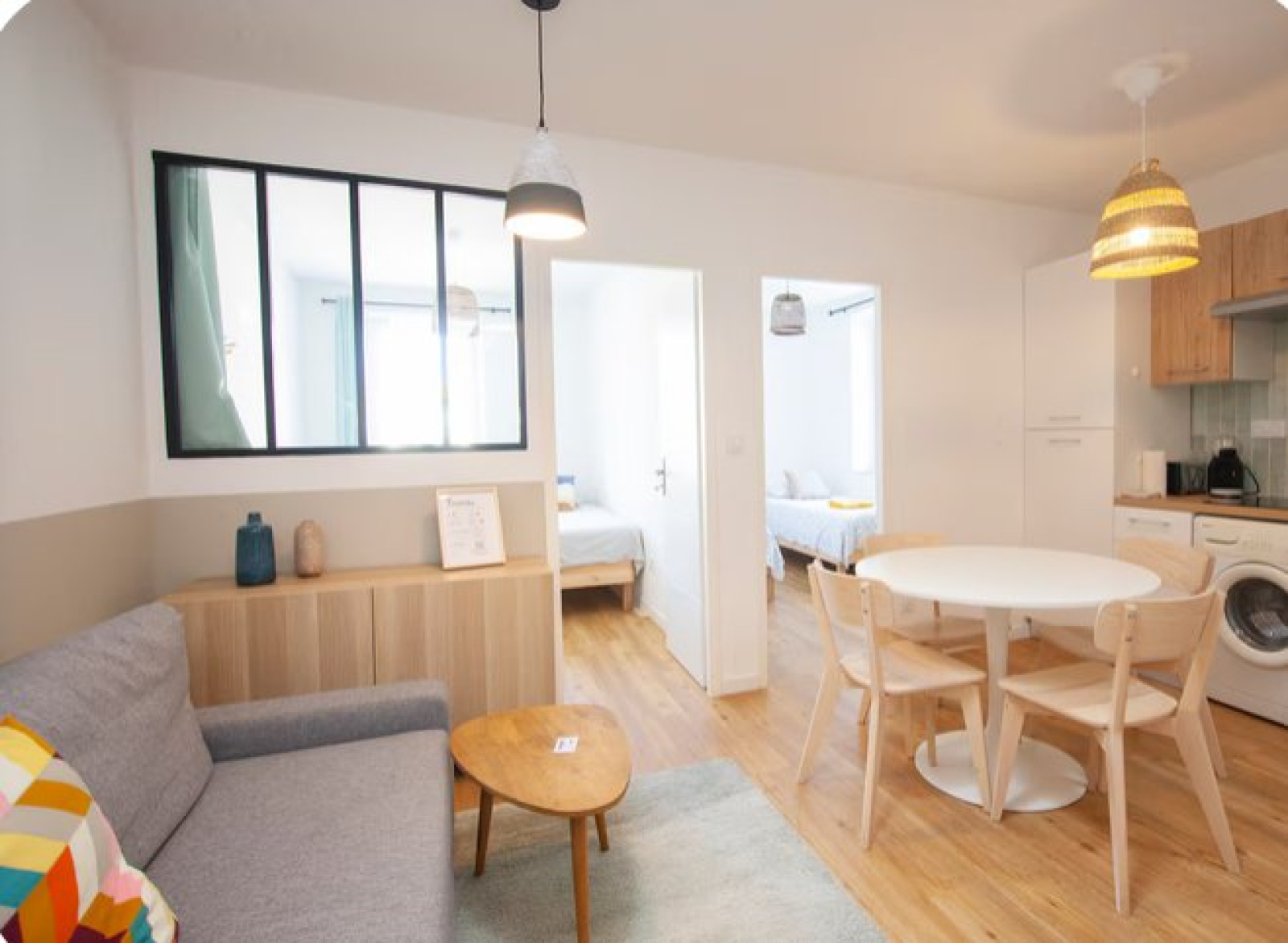 Ce logement comprend un séjour avec une cuisine ouverte, aménagée et équipée (hotte, micro-ondes, plaques, frigo, congélateur, lave-linge). Il dispose également de deux chambres, d'une salle d'eau et de toilettes.