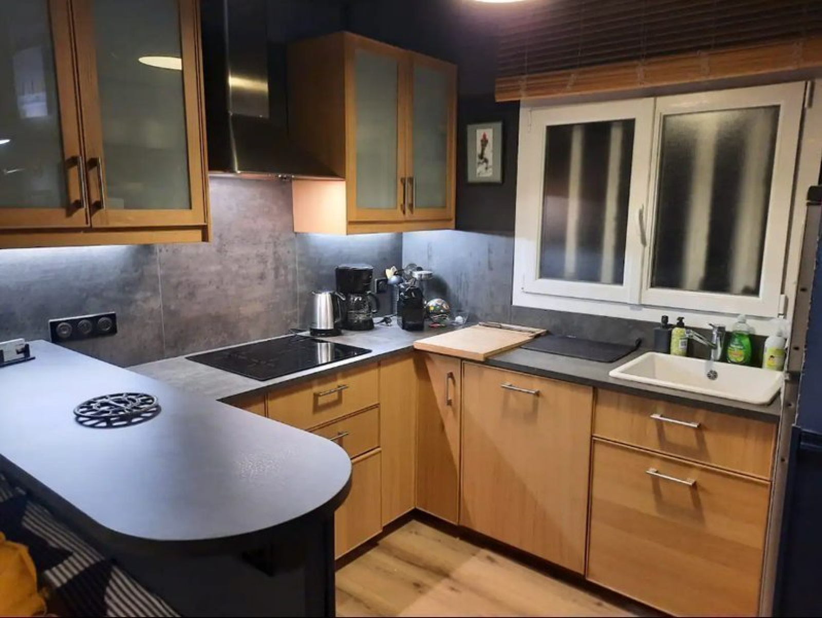 Cuisine ouverte avec comptoir, aménagée et équipée (hotte, four, plaques, réfrigérateur, congélateur, lave-vaisselle)