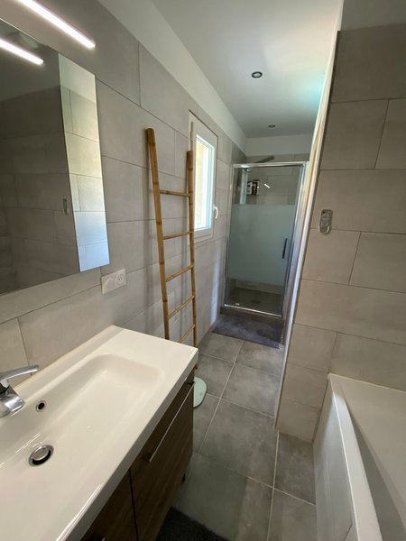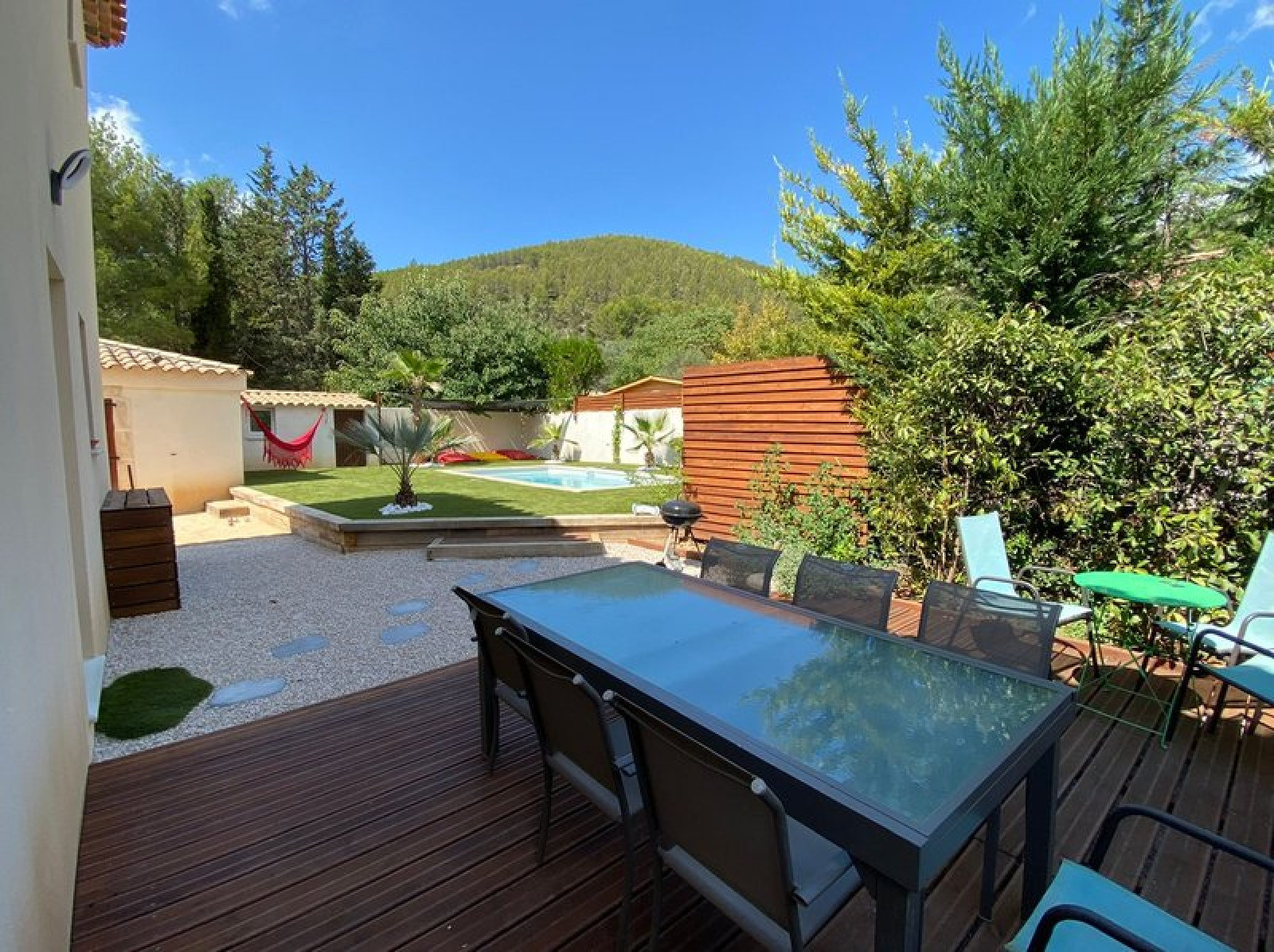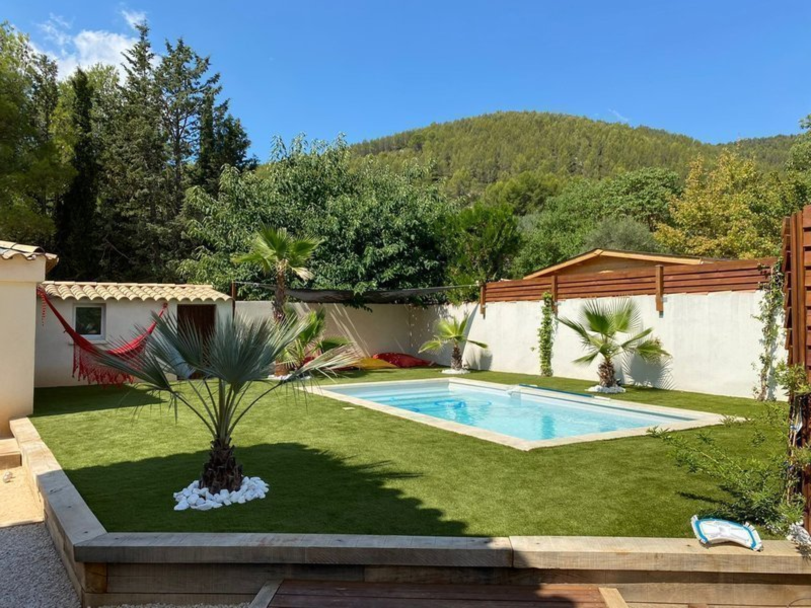 Avec terrain de boules, et pelouse synthétique. Loyer: 1590 €. Forfait: 450€