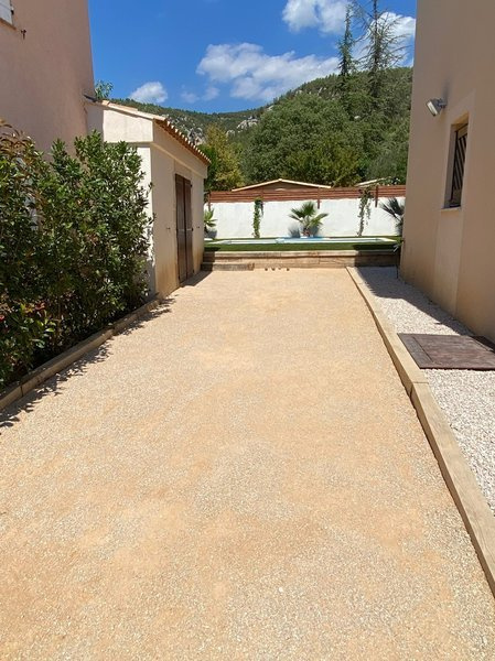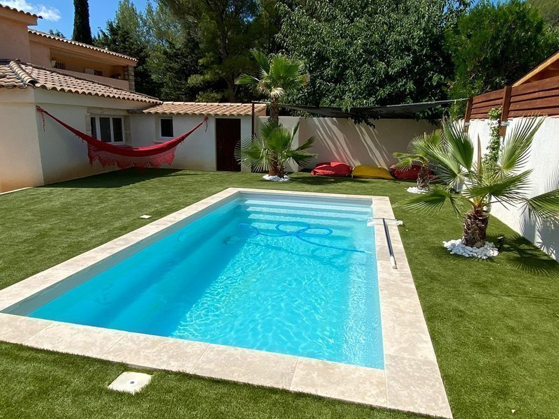 13780 Centre ville CUGES LES PINS entre février et juin Villa T4 96m2 habitable, Piscine Récent Hall ,Sejour ,Cuisine ouverte. aménagée. et équip. avec hotte frigo four plaques ,3 Chambres, salle de bains ,2 Wc ,Terrasse 100 m2, Jardin clôturé 500 m2, très bon état