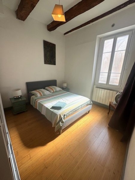 Sejour, Cuisine ouverture aménagée et équip avec hotte, frigo, four et plaques. Chambre, salle d'eau avec wc. Terrasse de 50 m2, Garage.